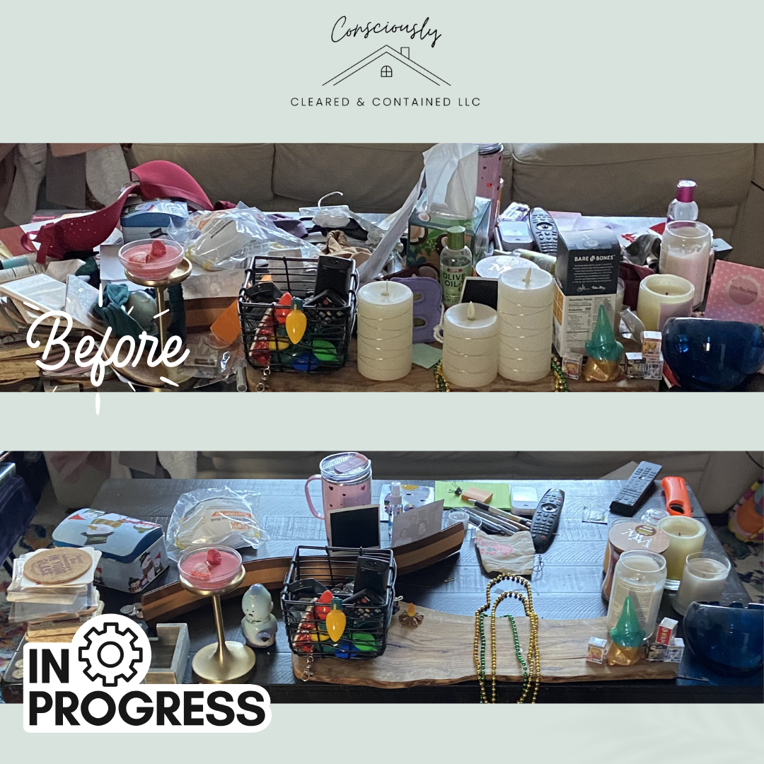 A ten-minute organizing burst in which we first cleared trash, grouped relocate items together (we filled a reusable bag with toiletries to be returned to the bedroom), identified a half dozen items for donation, grouped similar items together (office supplies, coasters, candles), and staged some joy-sparking items like decor and photos. She loves lighting candles and gladly donated the fake ones. Progress matters more than perfection. This is jumpstarting the process. You can do it.